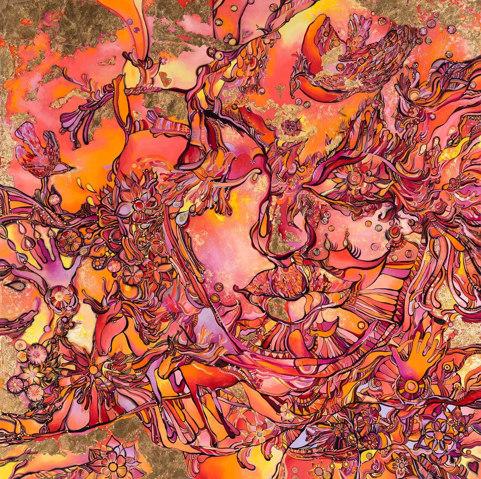 "Duende. Creative spirit of Love" Oil, acrylic, metal leaf, canvas, 60 x 60 inches, 2025